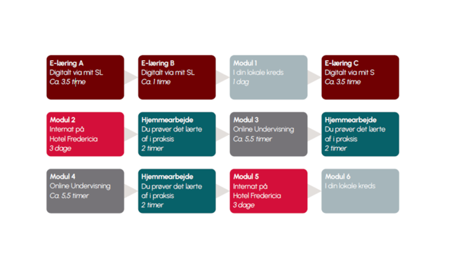 Uddannelsen består af seks moduler, der tilsammen skaber en rød tråd gennem dit læringsforløb. Den starter og slutter i din lokale kreds, hvilket giver dig et lokalt fundament, samtidig med at du opnår et stærkt netværk med TR’er fra hele landet gennem de nationale kurser.